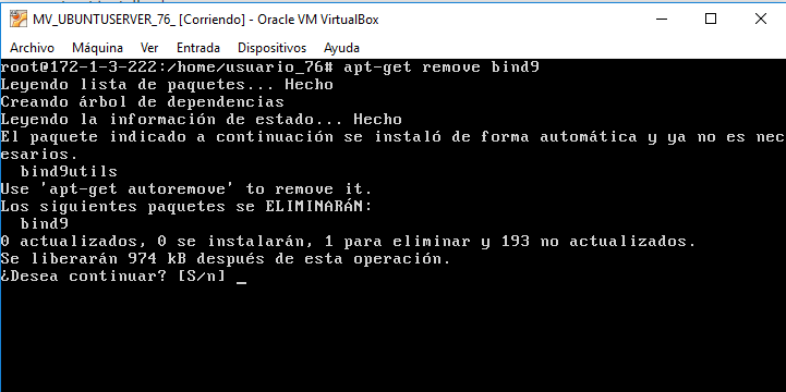 En este ejemplo procedimos a eliminar o desinstalar el servidor DNS bind9.